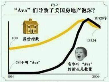 这个红线(图1)是希腊10年期国债的收益率,这个黄线就是Facebook的用户数量,这两个数据是没有任何关系的,对不对?但是它呈现了高相关性,如果按照技术分析,想知道希腊国债的收益率吗?关注Facebook,我如果不跟你说这个是Facebook,我就跟你说是某个神奇的跟八卦有关的一个东西,我随便编,你会觉得神指标、神指标啊。这是美国房地产的指数,这个(图2)是在AVA儿童出生的数量,也是没有关系的,对不对?